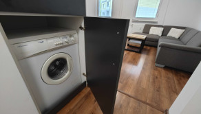 - gauč v tvare L, chladnička, mikrovlnná rúra, sporák, rolldor, obývacia stena, tv, stôl, stoličky, práčka, botníková stena,..